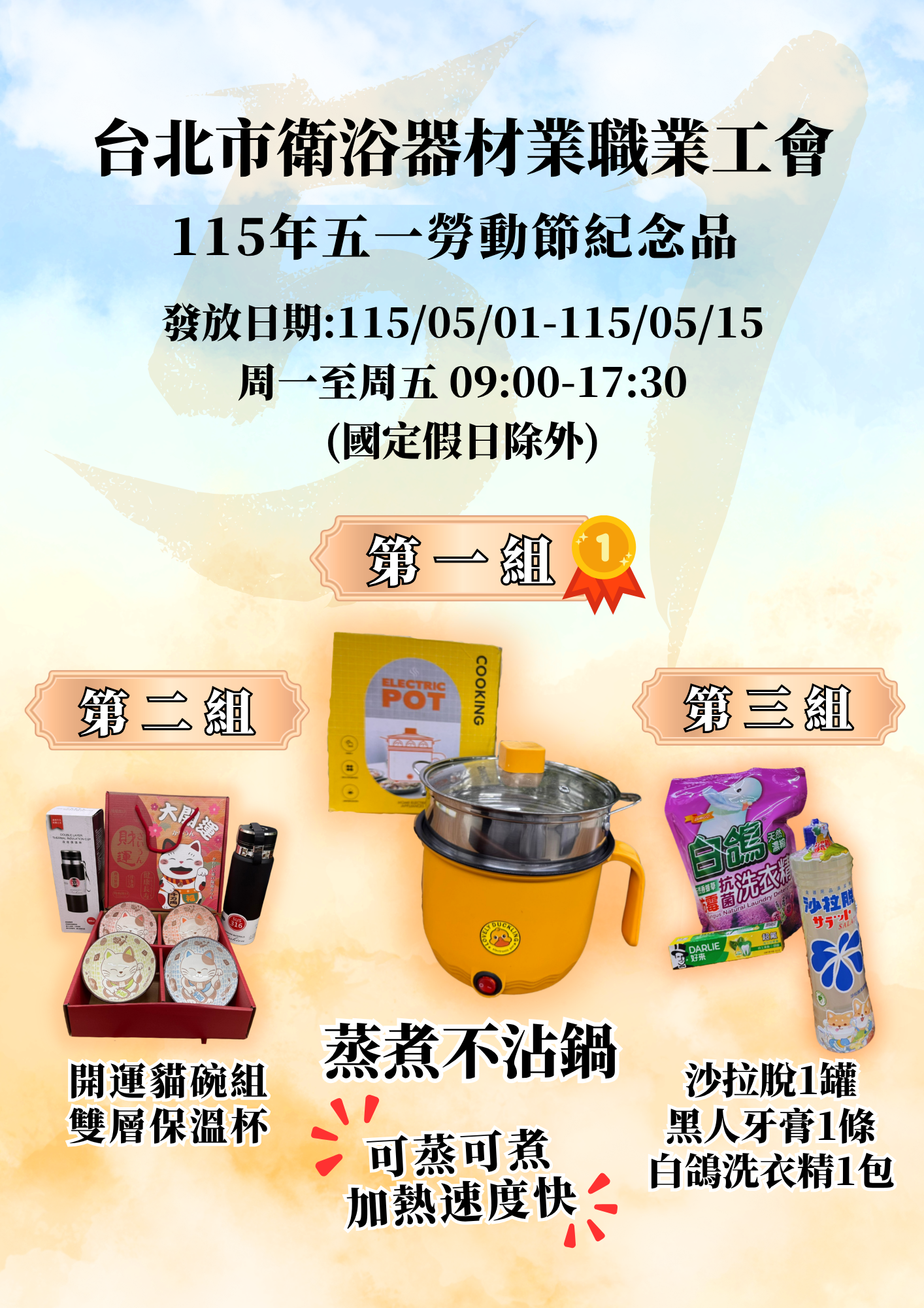 臺北市衛浴器材服務職業工會 115年五一勞動念品資訊 發放時間:115/05/01-115/05/15 星期一至星期五 09:00-17:30(國定假日除外)請領資格:需入會滿二年以上 1.蒸煮不沾鍋2.開運貓碗組+雙層保溫杯3.沙拉脫+黑人牙膏+白鴿洗衣精(3選1) 回列表 下一個